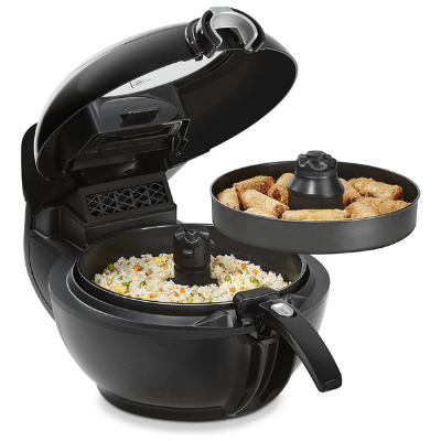 Tiene dos sistemas de cocción patentados, el sistema Actifry con el que el aire caliente circula por toda la cubeta cocinando los alimentos de manera uniforme y, un brazo giratorio que remueve los alimentos y reparte el poco aceite que uses para cocinar.