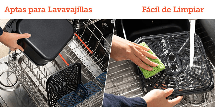 - Retira la cesta y la bandeja antiadherente de la freidora. Estos componentes son aptos para lavavajillas, por lo que puedes lavarlos a mano o colocarlos en el lavavajillas.