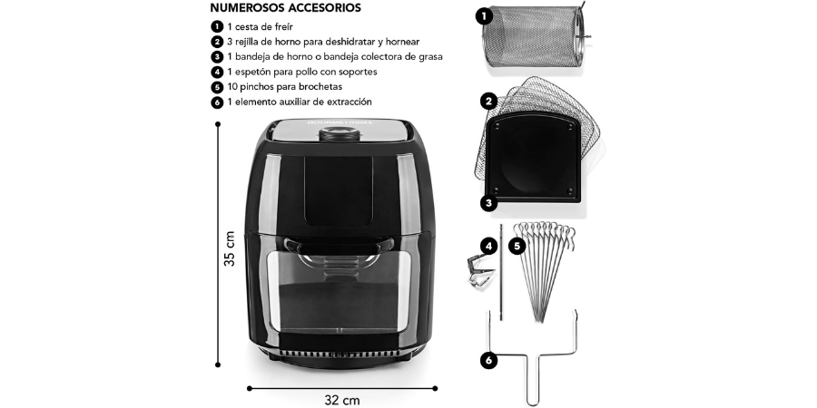 - Versatilidad Culinaria 3 en 1: Con la capacidad de ser freidora, horno y grill giratorio, esta freidora amplía tus opciones culinarias y te permite preparar una variedad de platos con una sola máquina.