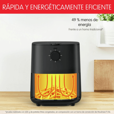 - Ahorro energético: La Moulinex Easy Fry Essential te permite ahorrar hasta un 70% de energía en comparación con un horno tradicional de Clase Energética A. Esto significa una cocina más rápida y económica con un menor consumo de electricidad.