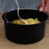 Añadimos el huevo y removemos bien para repartir el huevo por todo el molde. Ponemos el molde dentro de la cubeta y programamos la freidora a 200º durante 5 minutos.