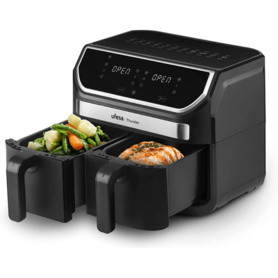 Doble Cubeta y Capacidad Total de 9L: Una de las características destacadas de la Ufesa Thunder es su doble cubeta con una capacidad total de 9L. Cada cubeta tiene una capacidad de 4.5L, lo que te permite cocinar dos platos distintos simultáneamente. Puedes seleccionar el programa deseado o ajustar el tiempo y la temperatura de forma personalizada para cada cubeta, lo que te brinda flexibilidad y opciones culinarias. Con esta capacidad, la freidora es ideal para familias o para cocinar cuando tienes invitados.